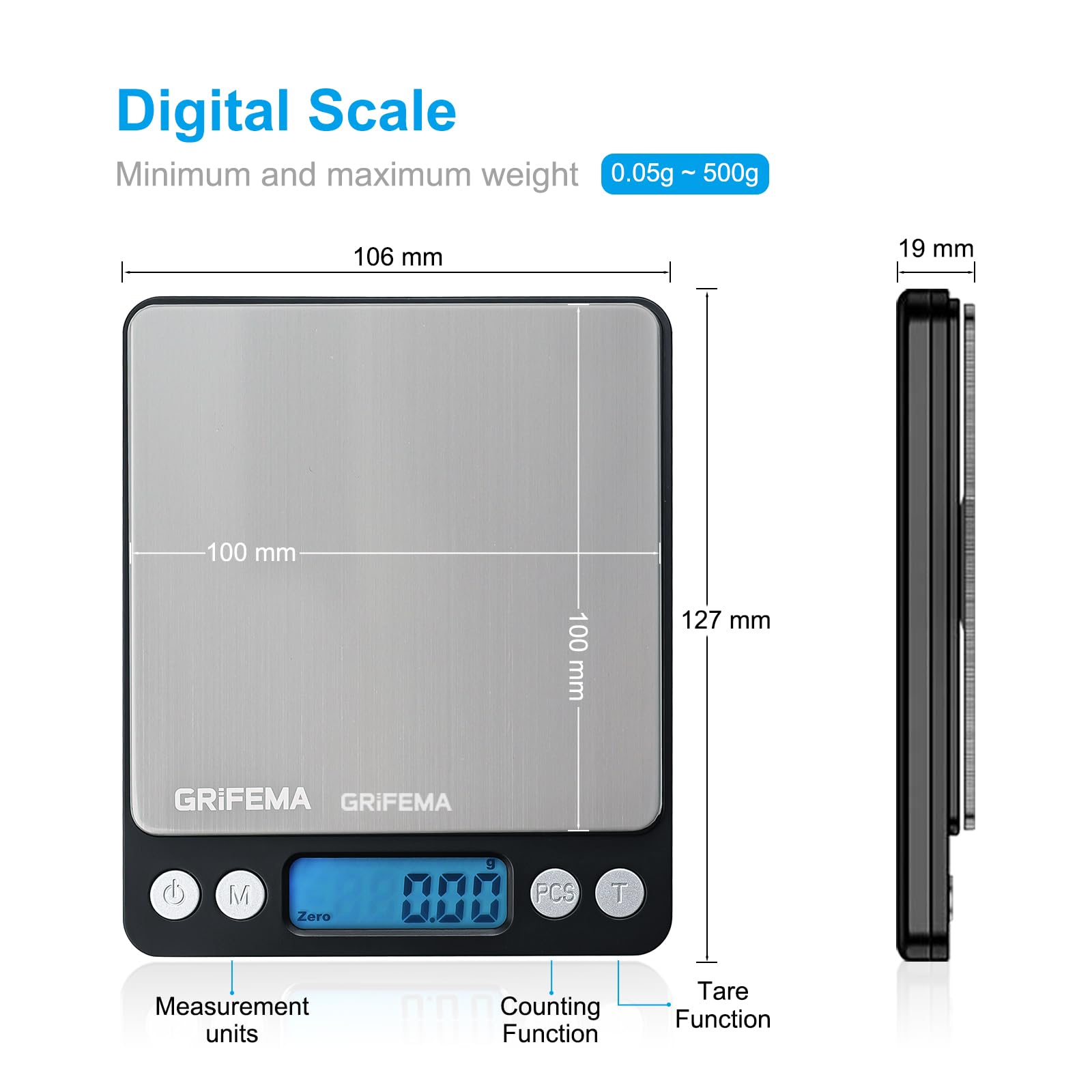GRIFEMA GA2003 Balance de Cuisine Électronique 0,05-500g, Précision 0,01g, Plateau 10x10cm Acier Inoxydable, Écran LCD Rétroéclairé, 6 Unités de Mesure, Fonction Tare