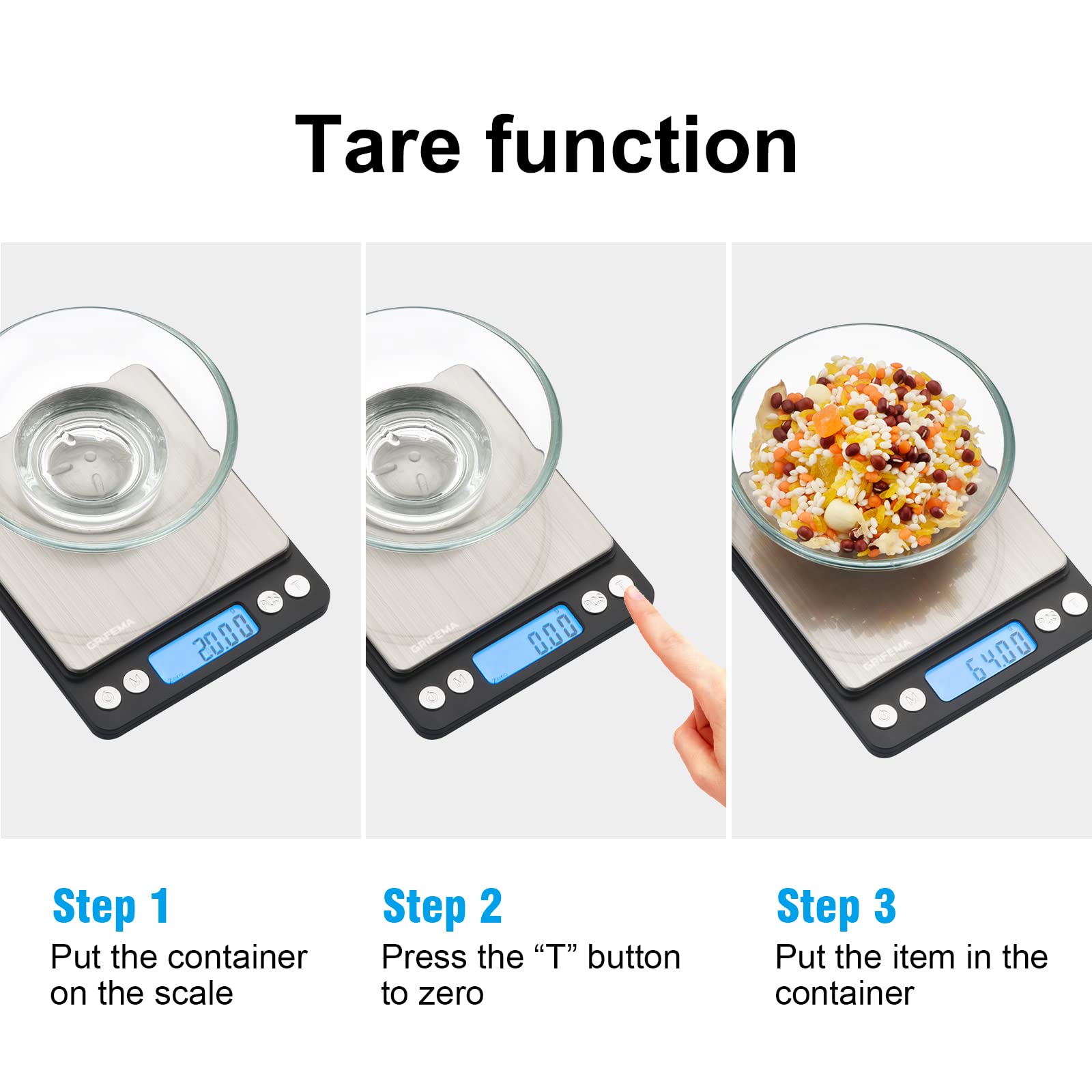 - Fonction de Tare: Comprend les fonctions de tare et de mise à zéro pour une compatibilité facile avec d'autres conteneurs. Mesurez les alimentaires dans les tasse, assiette ou bol des tailles différentes avec une précision facile et sans tracas